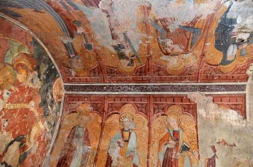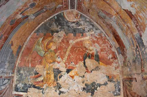 Sulla parete di fondo di vede un'Annunciazione. Sulle pareti laterali sono dipinti a sinistra S. Antonio, S. Sebastiano, S. Paolo e S. Pietro e sul lato destro Santa Caterina, Santa Lucia, Sant'Agata ed una figura corrosa che è stata interpretata come S. Bernardo.